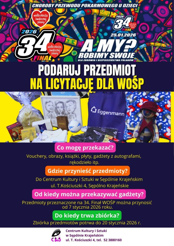 Zbliża się kolejny Finał Wielkiej Orkiestry Świątecznej Pomocy, a my już przygotowujemy się do licytacji! Jeśli chcesz dorzucić swoją cegiełkę i pomóc, możesz przekazać przedmiot, który trafi na aukcję WOŚP podczas finału w Sępólnie Krajeńskim.