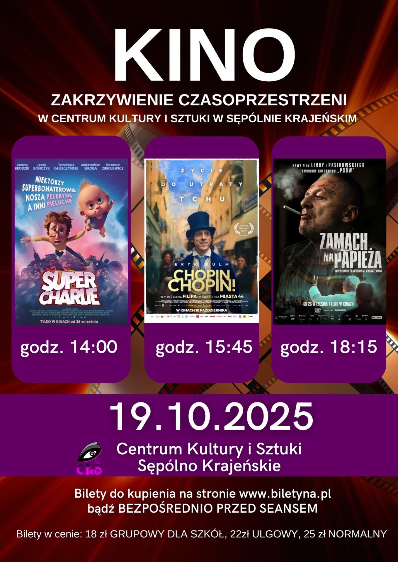 Zapraszamy Was do kina 19 października 2025 r. wraz z Zakrzywieniem Czasoprzestrzeni, w Centrum Kultury i Sztuki w Sępólnie Krajeńskim wyświetlimy dla Was filmy: „Super Charlie”, „Chopin, Chopin!” oraz „Zamach na papieża”. Bilety dostępne są już w przedsprzedaży na stronie https://biletyna.pl/Sepolno-Krajenskie. Istnieje także możliwość kupna biletów bezpośrednio przed seansem. Jednocześnie informujemy, że Centrum Kultury i […]