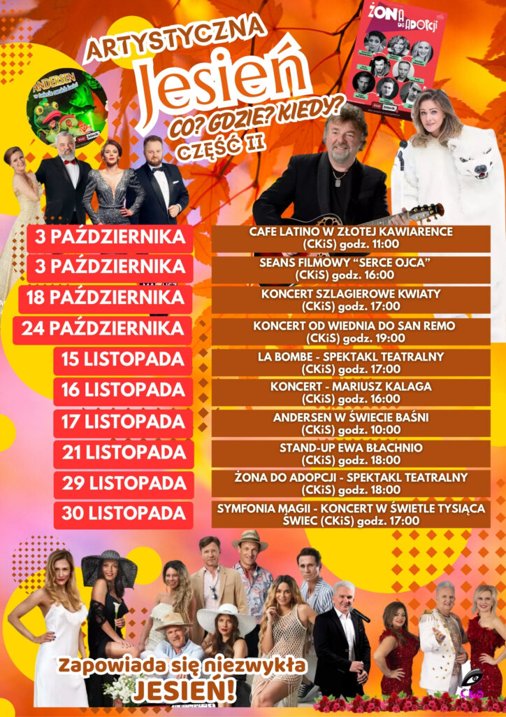 Przed nami niezwykłe tygodnie pełne muzyki, teatru, kina i dobrej rozrywki! Centrum Kultury i Sztuki w Sępólnie Krajeńskim zaprasza na drugą część cyklu „Artystyczna Jesień”, która obfituje w wyjątkowe wydarzenia – od koncertów, przez spektakle teatralne, aż po spotkania z kabaretem i sztuką filmową.