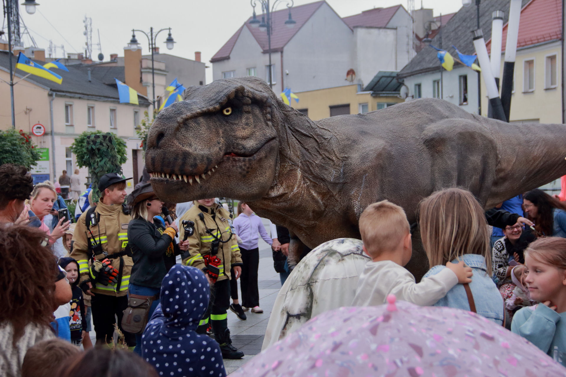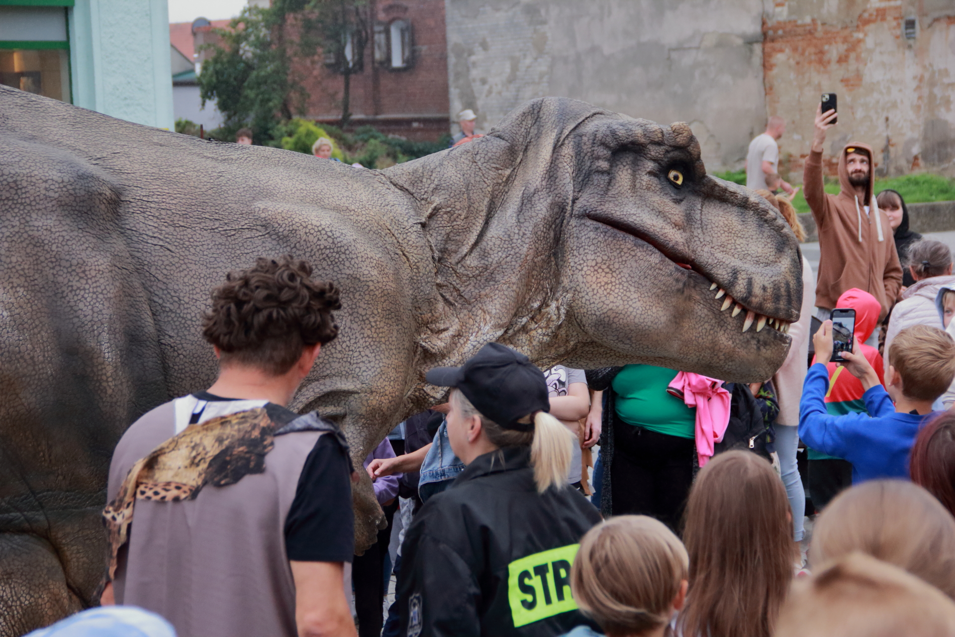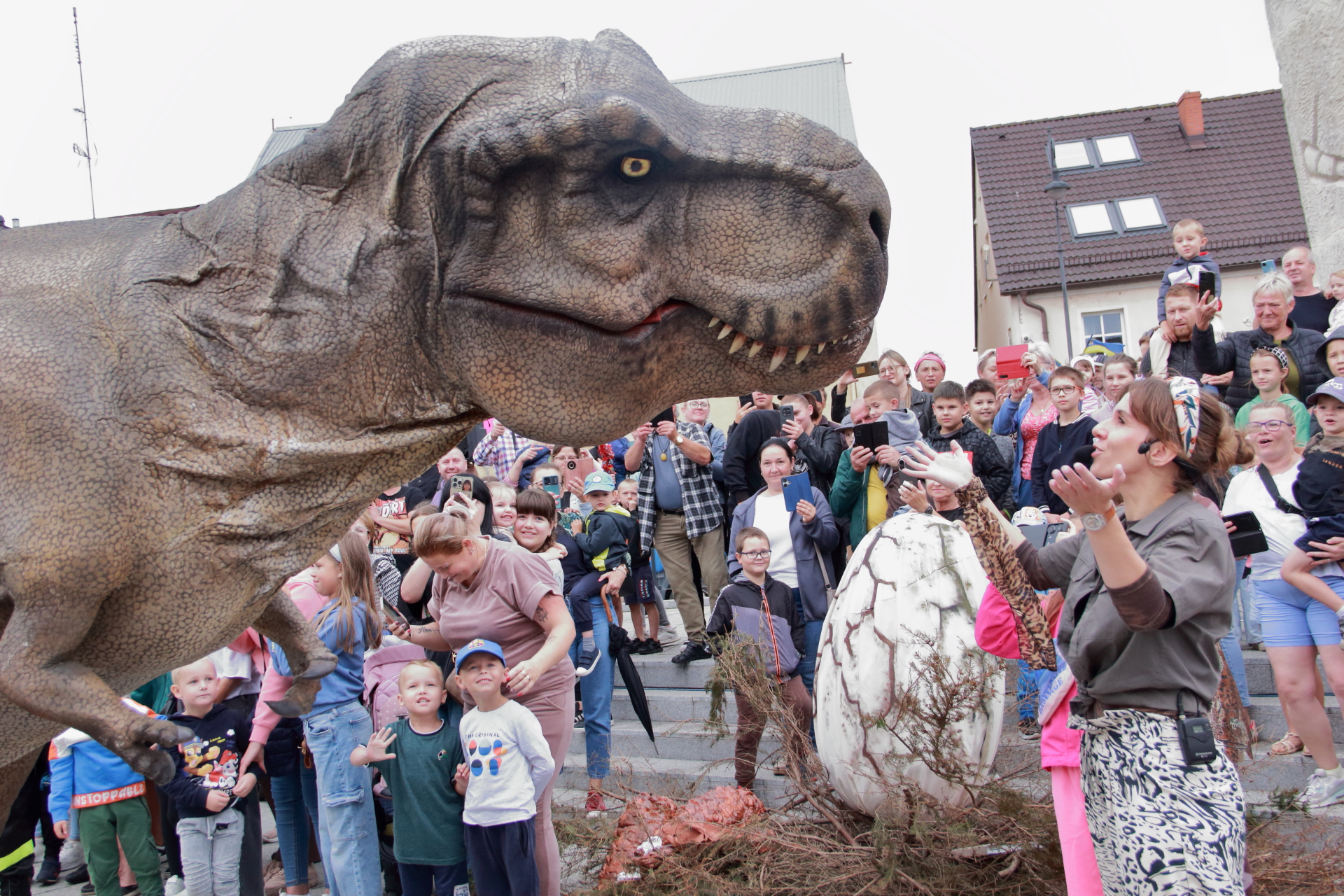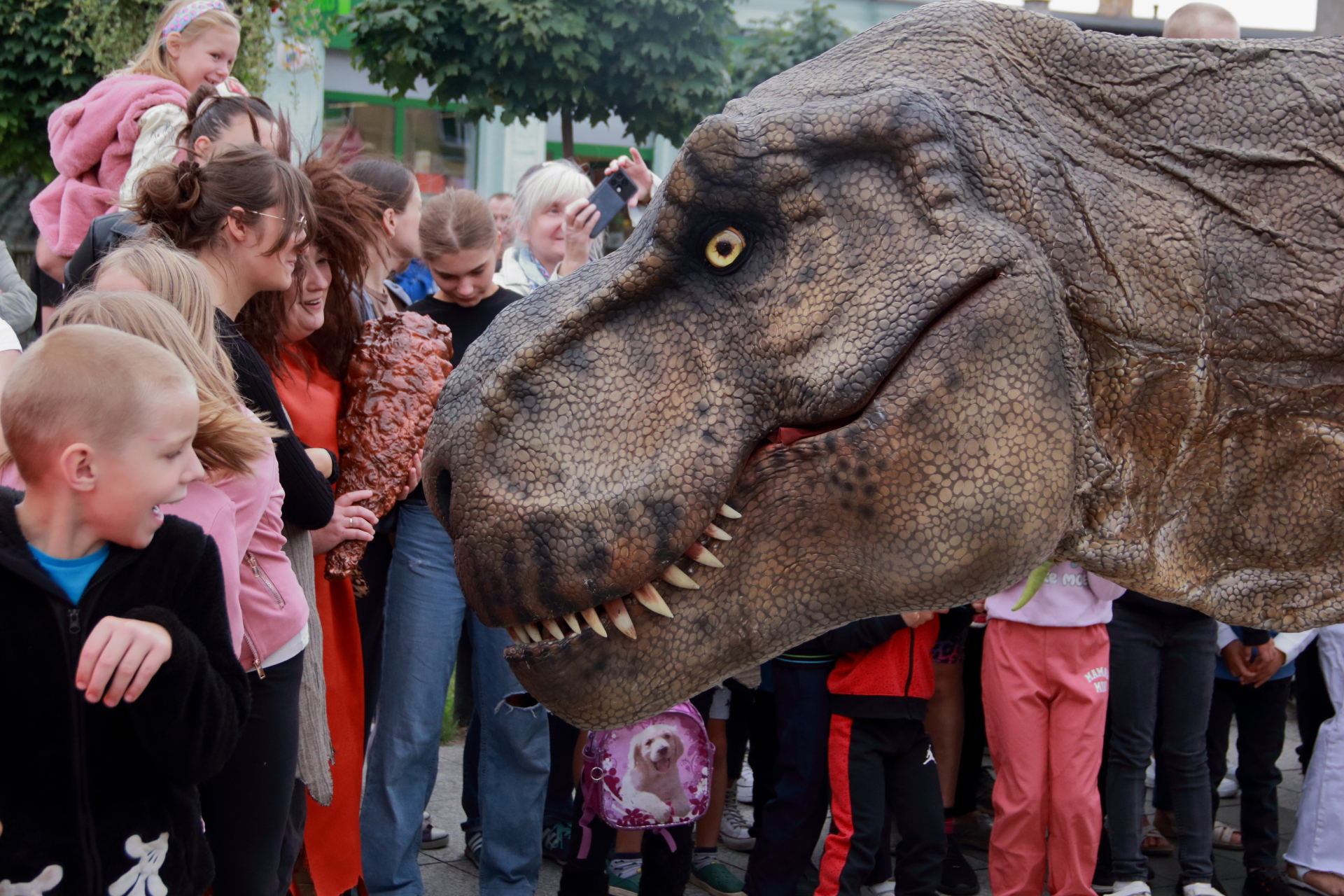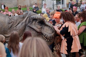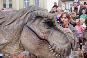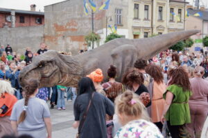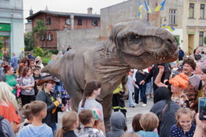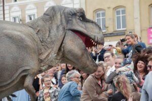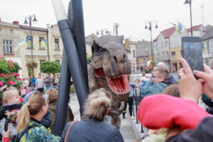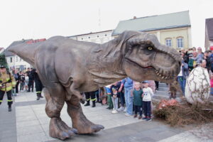 T-Rex, choć wyglądał groźnie, okazał się wyjątkowo towarzyski i skory do zabawy. Dzieci z radością uczestniczyły w jego „wybudzaniu”, a następnie w licznych animacjach i harcach. Wydarzenie przyciągnęło tłumy – nie zabrakło zachwyconych rodzin, aparatów fotograficznych i szerokich uśmiechów.