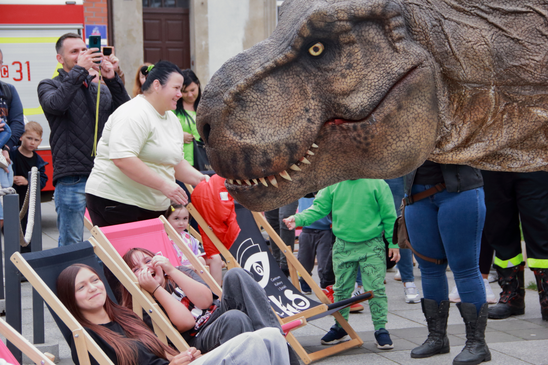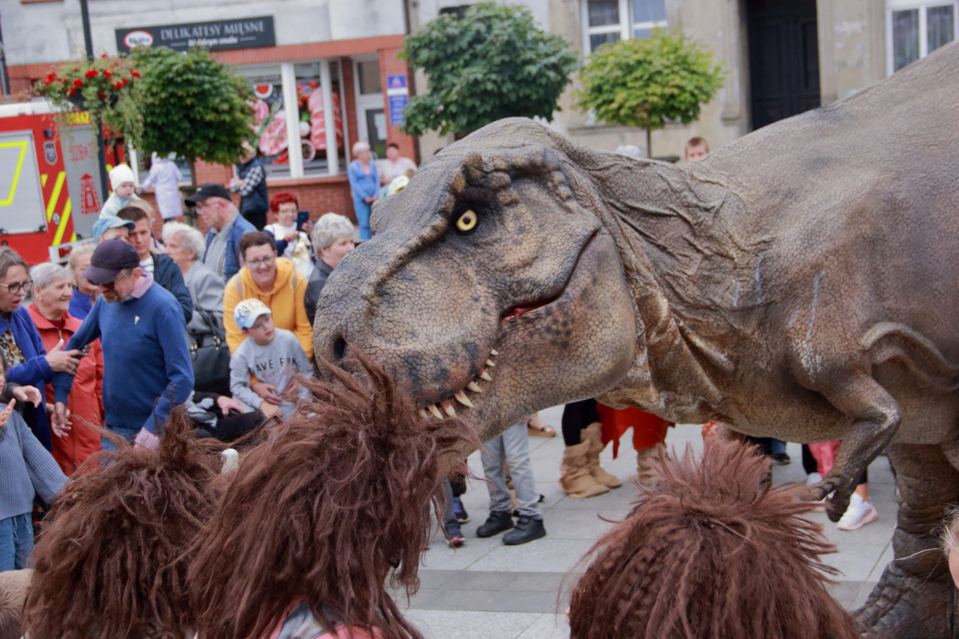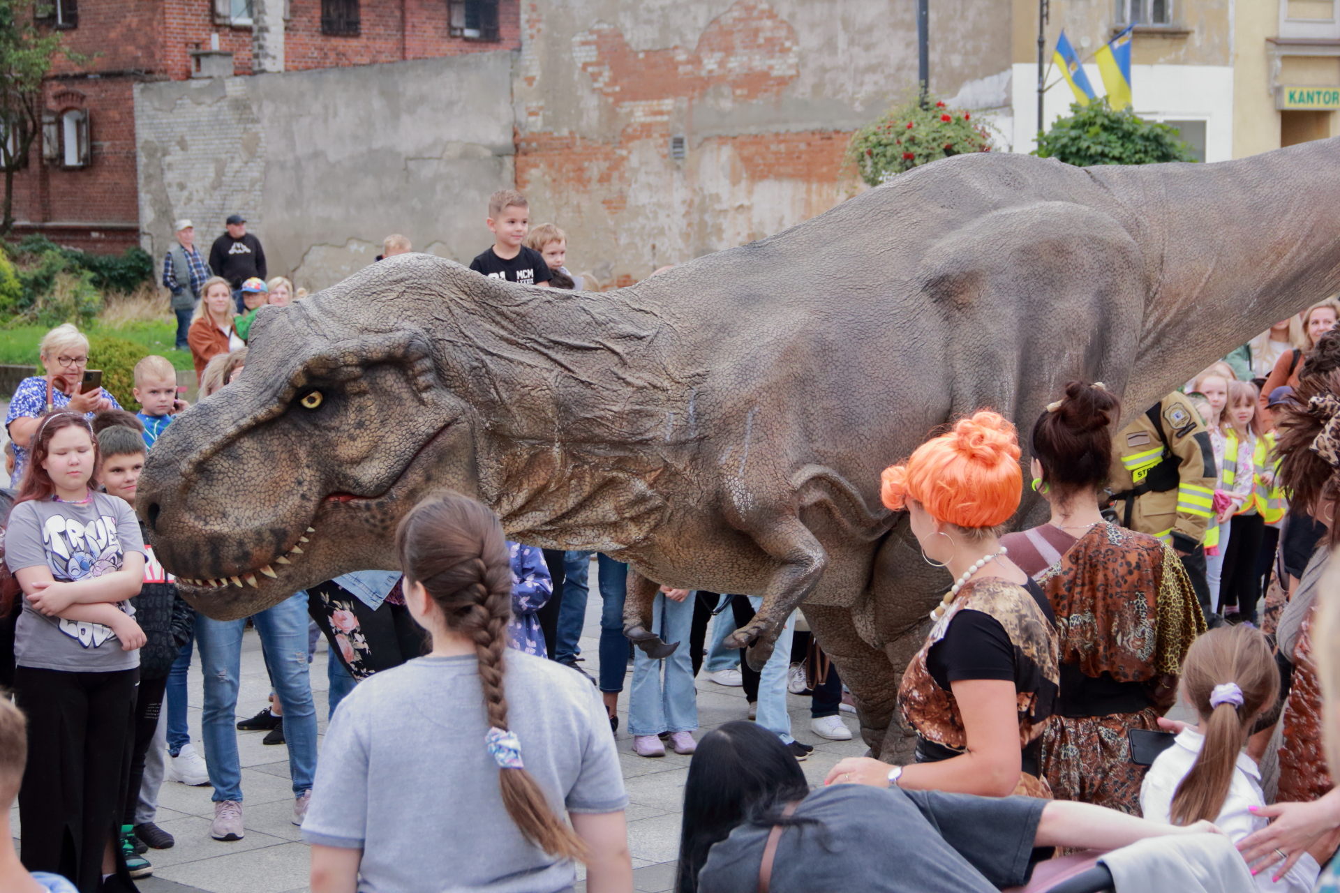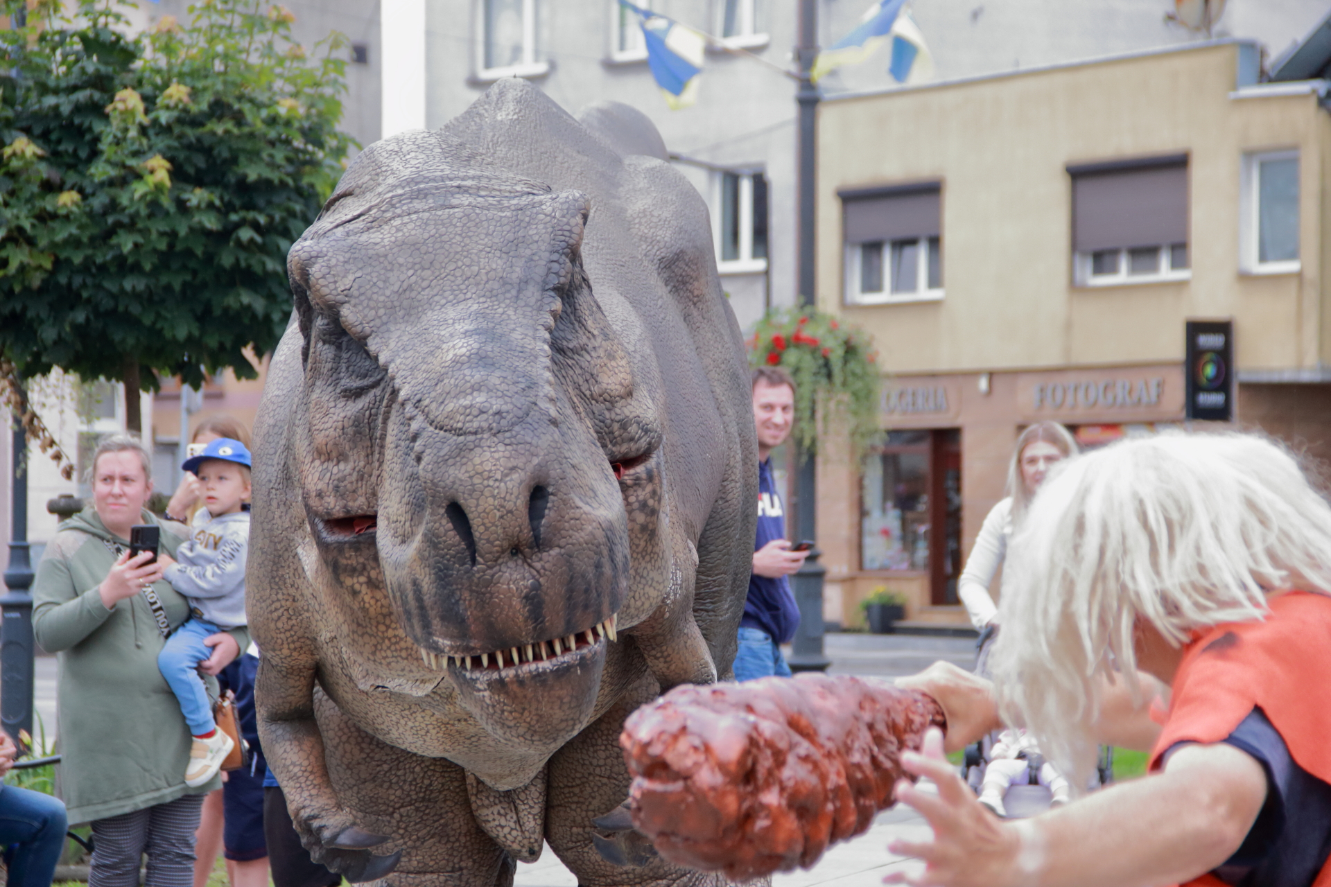 T-Rex, choć wyglądał groźnie, okazał się wyjątkowo towarzyski i skory do zabawy. Dzieci z radością uczestniczyły w jego „wybudzaniu”, a następnie w licznych animacjach i harcach. Wydarzenie przyciągnęło tłumy – nie zabrakło zachwyconych rodzin, aparatów fotograficznych i szerokich uśmiechów.