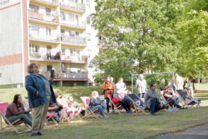 Publiczność dopisała – na trawie rozgościły się rodziny z dziećmi, sąsiedzi przynosili koce i krzesełka, a wielu mieszkańców słuchało koncertu z balkonów i okien swoich mieszkań. Pogoda sprzyjała, a wspólna atmosfera sprawiła, że tego wieczoru całe osiedle tętniło życiem i muzyką.