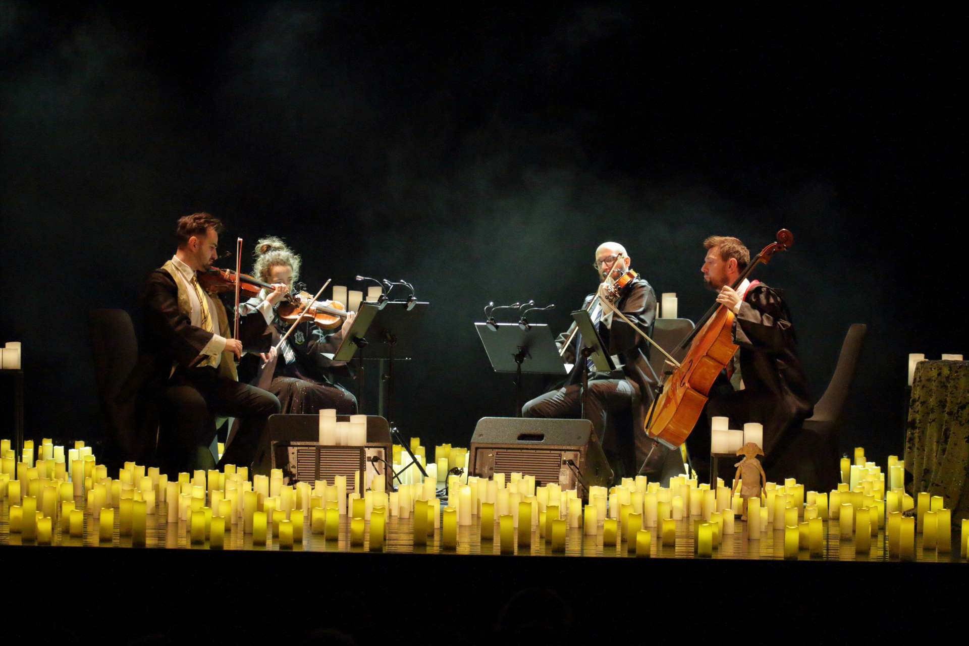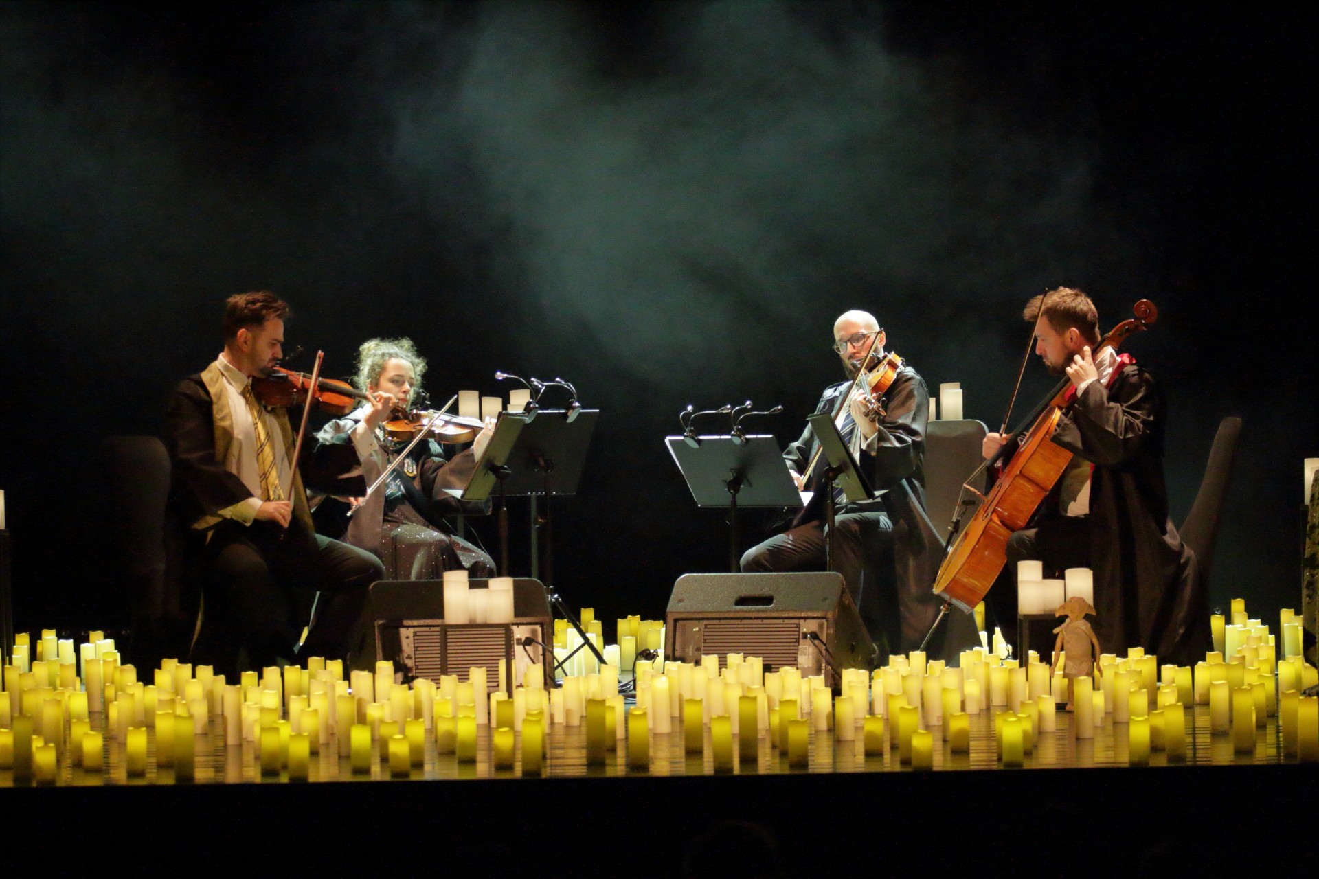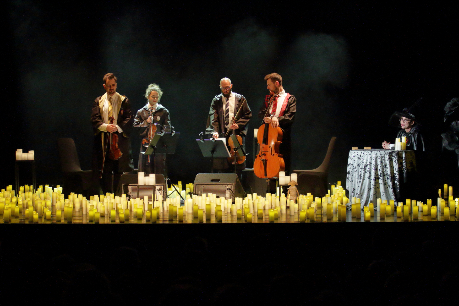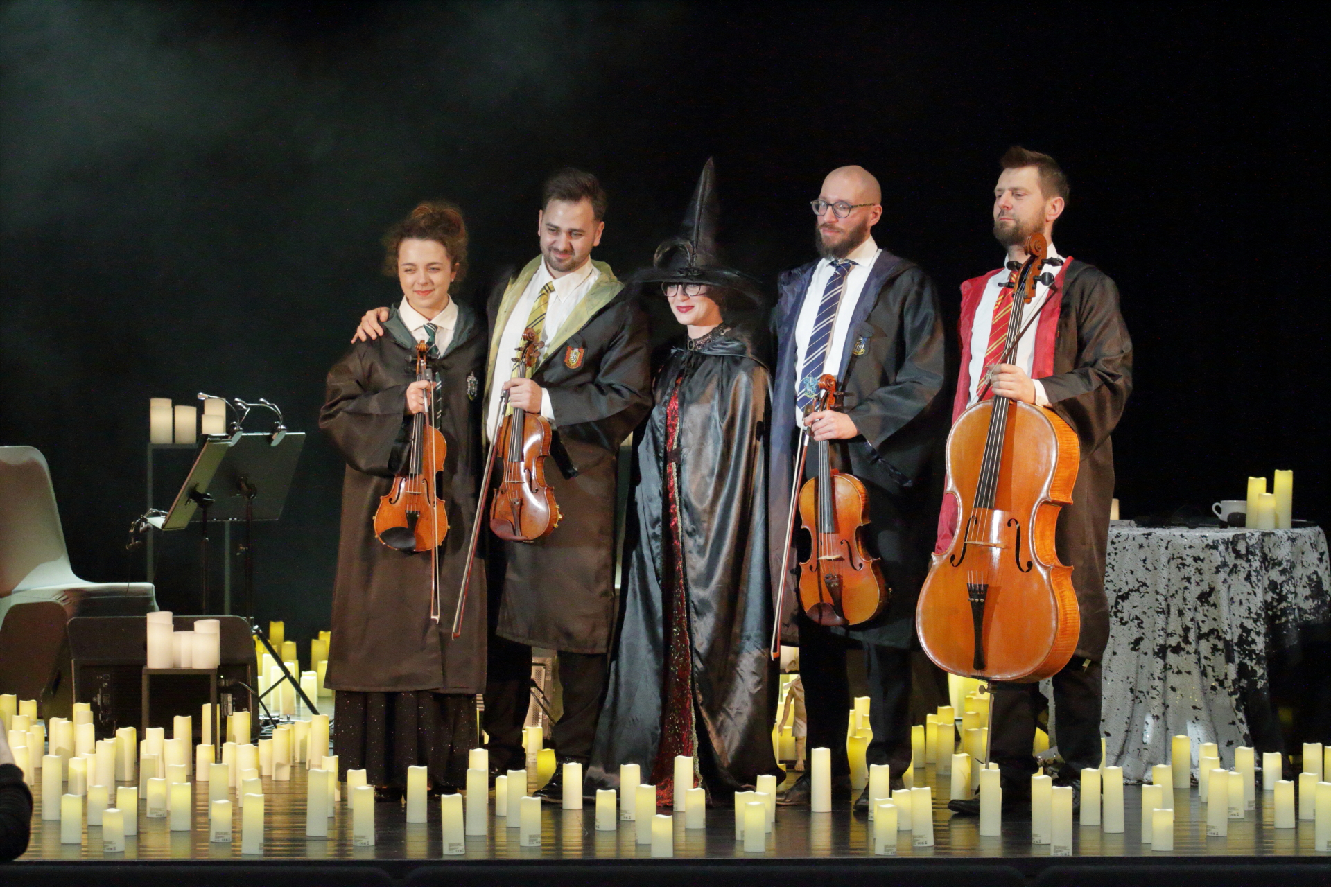 Na scenie wystąpił kwartet smyczkowy, który zachwycił publiczność wykonaniem najbardziej znanych tematów muzycznych: od delikatnych, tajemniczych melodii, po potężne utwory przywołujące wspomnienia wielkich finałów. Każdy dźwięk budził emocje i przywoływał obrazy starych korytarzy, magicznych lekcji oraz przygód, które rozgrzewały wyobraźnię.