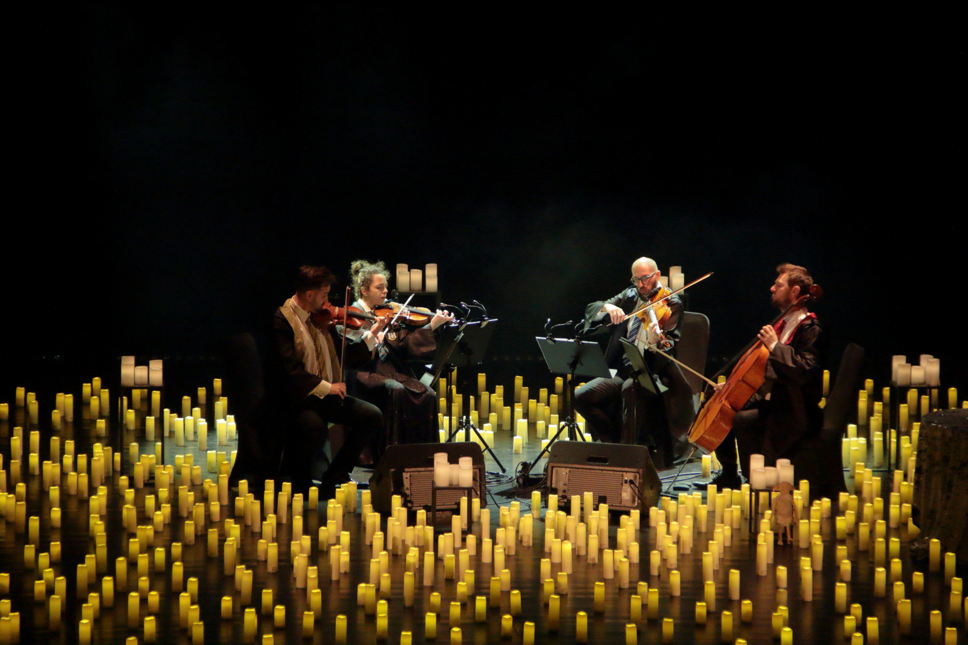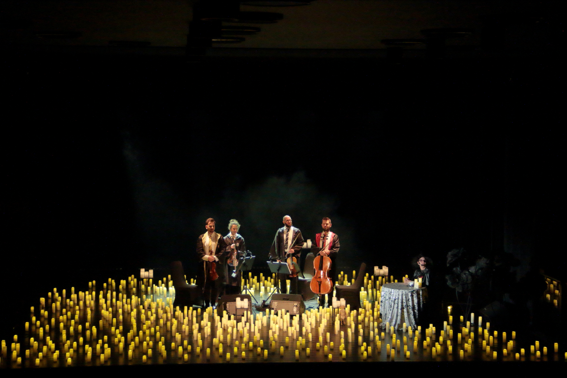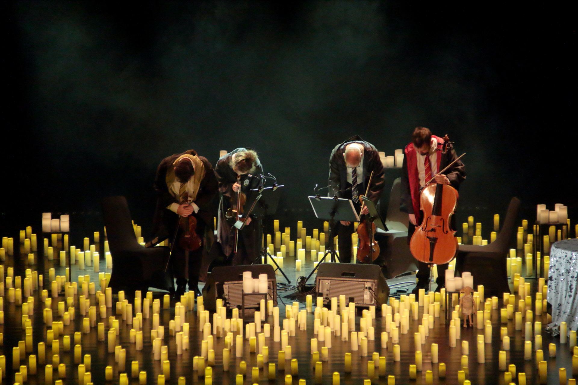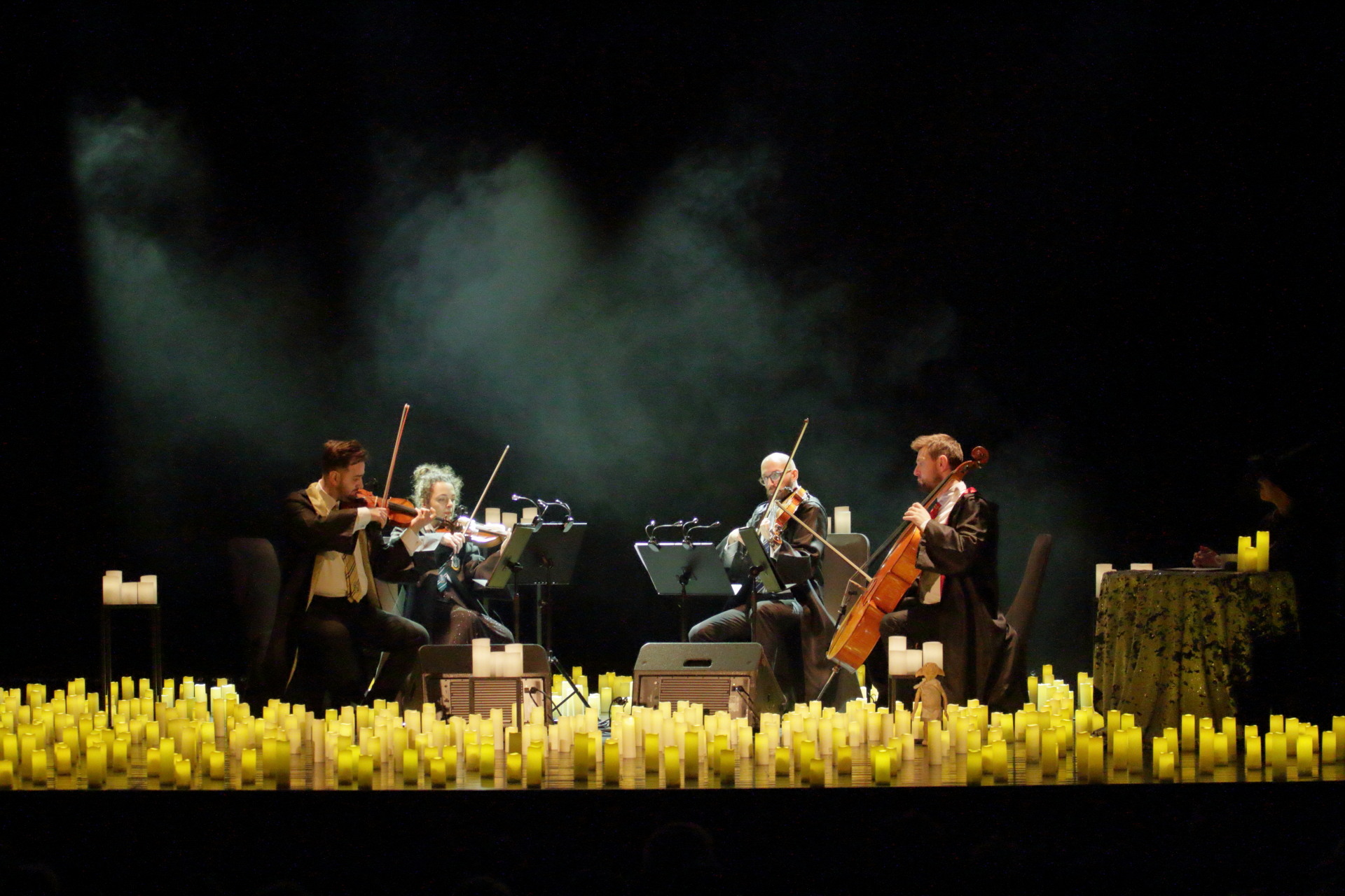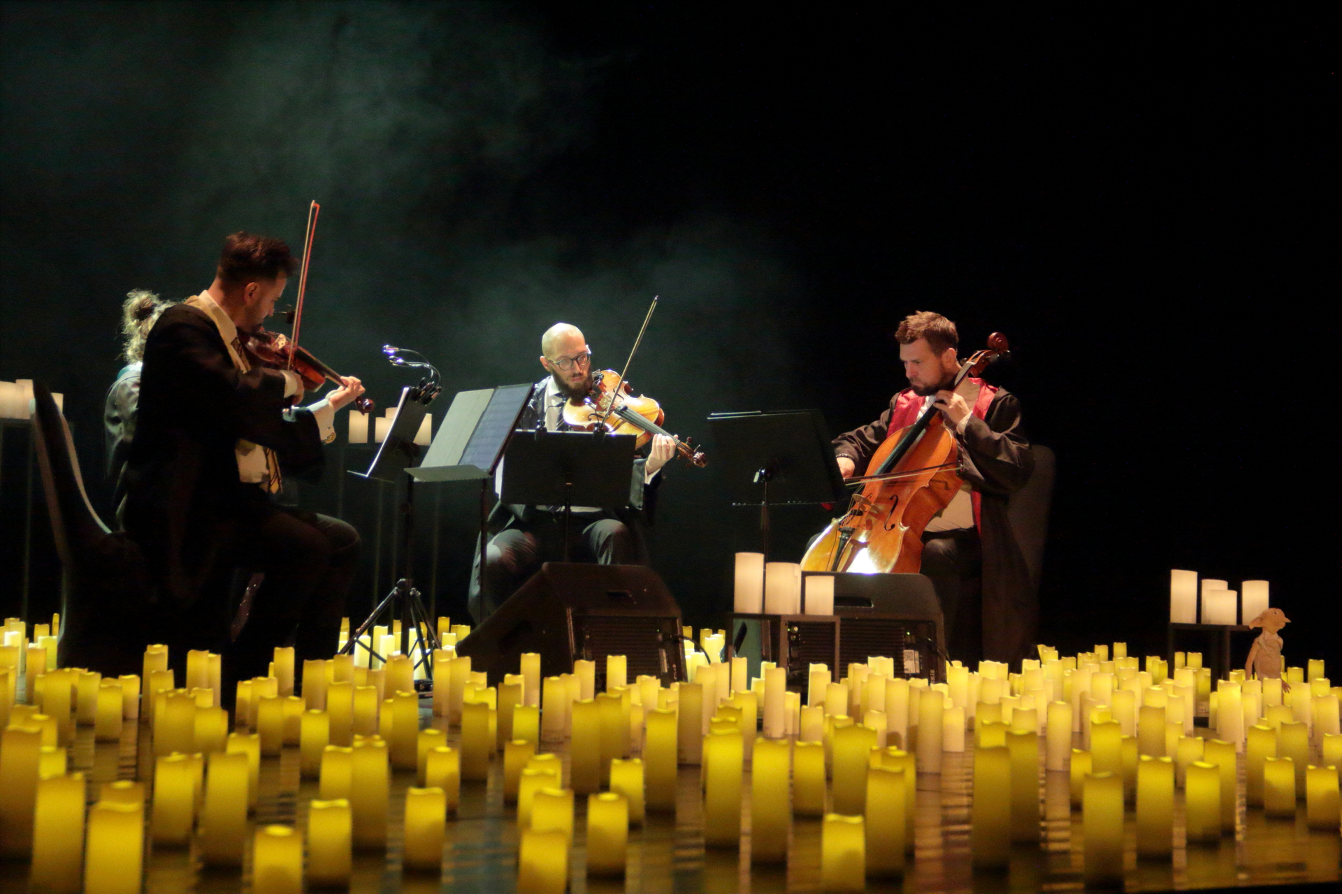 Na scenie wystąpił kwartet smyczkowy, który zachwycił publiczność wykonaniem najbardziej znanych tematów muzycznych: od delikatnych, tajemniczych melodii, po potężne utwory przywołujące wspomnienia wielkich finałów. Każdy dźwięk budził emocje i przywoływał obrazy starych korytarzy, magicznych lekcji oraz przygód, które rozgrzewały wyobraźnię.