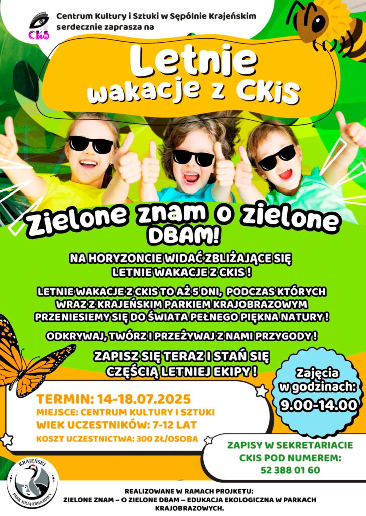 Zbliżają się upragnione wakacje, a my mamy dla Was wyjątkową propozycję! Przygotujcie się na 5 dni wyzwań, twórczych odkryć i niezapomnianych przygód. „Zielone znam o zielone dbam” w Centrum Kultury i Sztuki w Sępólnie Krajeńskim to doskonała okazja, aby spędzić czas w wyjątkowy sposób, rozwijając swoją kreatywność i przyrodniczą wiedzę w znakomitym towarzystwie.