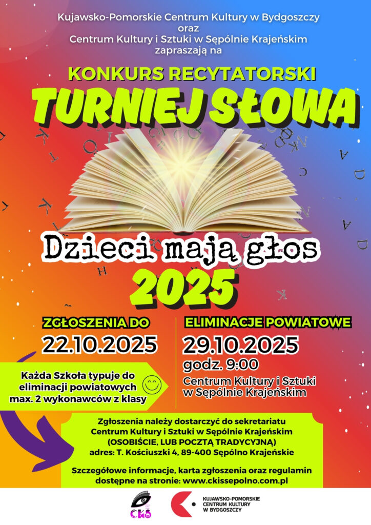 Eliminacje powiatowe Turnieju recytatorskiego odbędą się 29 października 2025 r. w Centrum Kultury i Sztuki w Sępólnie Krajeńskim o godz. 9:00. Wypełnioną KARTĘ ZGŁOSZENIA należy dostarczyć w nieprzekraczalnym terminie do dnia: 22.10.2025 r., do sekretariatu Centrum Kultury i Sztuki w Sępólnie Krajeńskim (osobiście, lub pocztą tradycyjną) adres: T. Kościuszki 4, 89-400 Sępólno Krajeńskie.