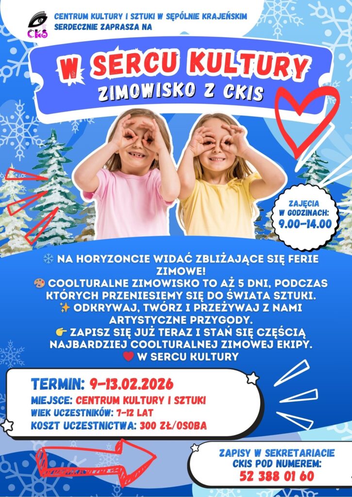 Ferie „W sercu kultury” to zimowisko artystyczne organizowane przez Centrum Kultury i Sztuki w Sępólnie Krajeńskim – idealna okazja, aby spędzić czas twórczo, rozwijać swoje pasje i odkrywać świat sztuki w inspirującym gronie.