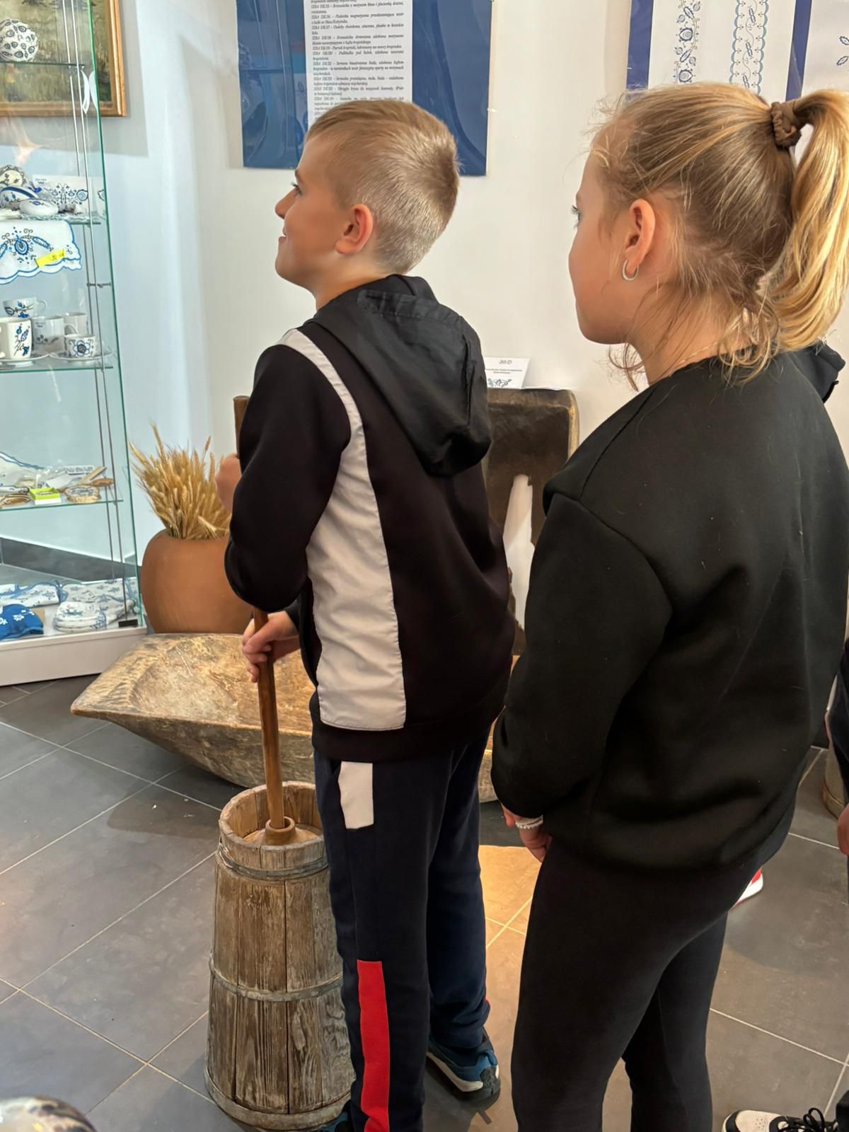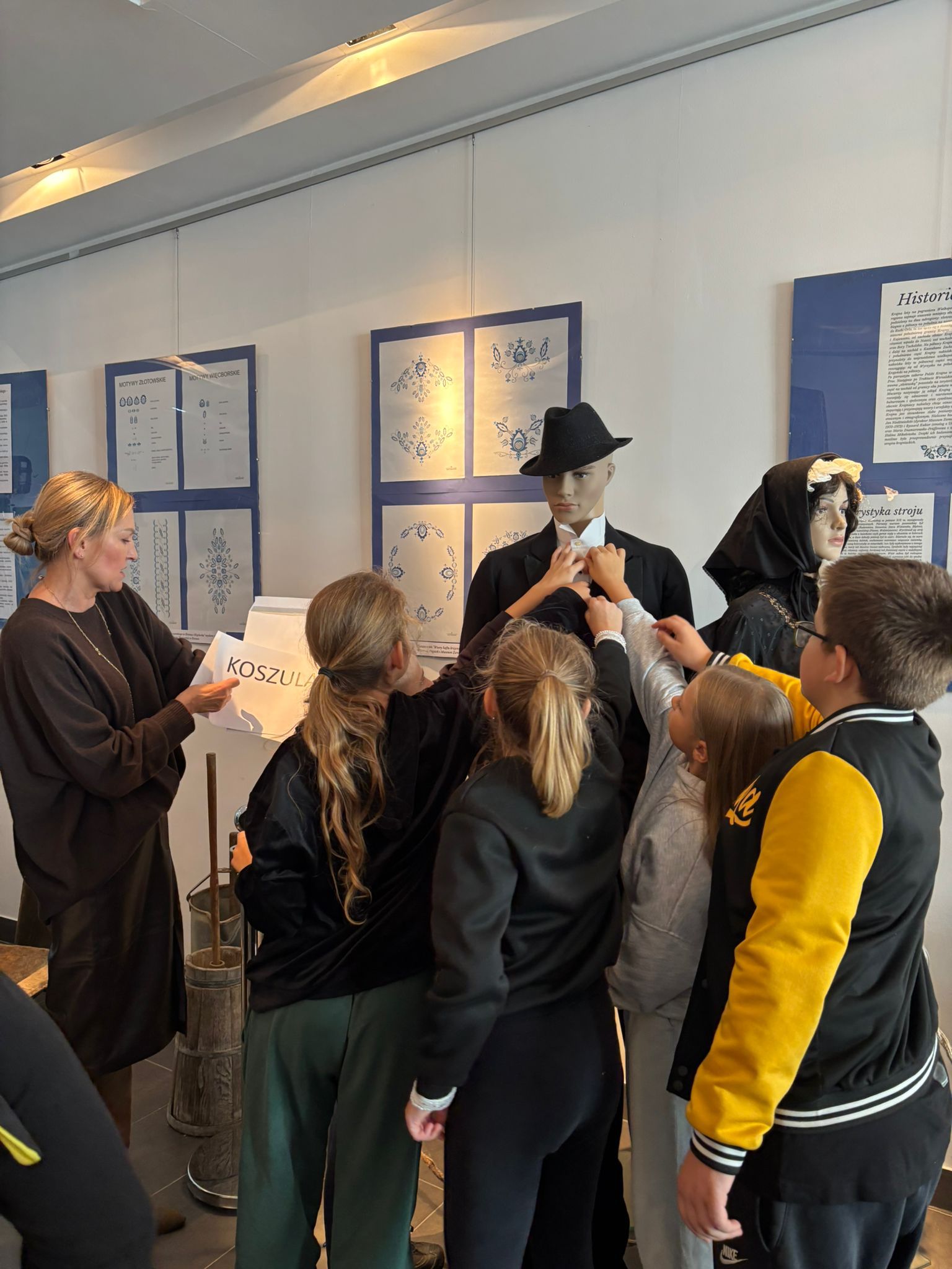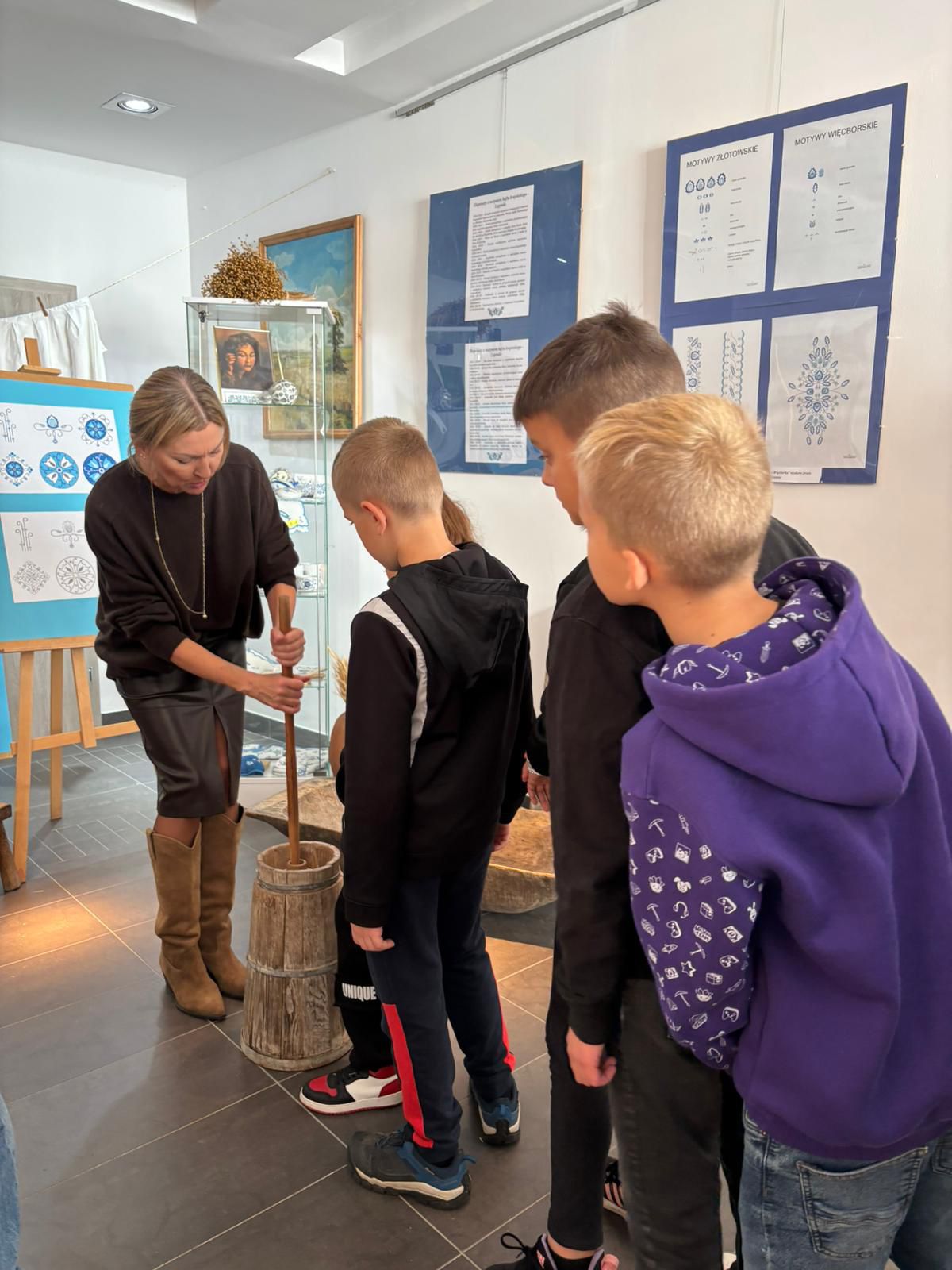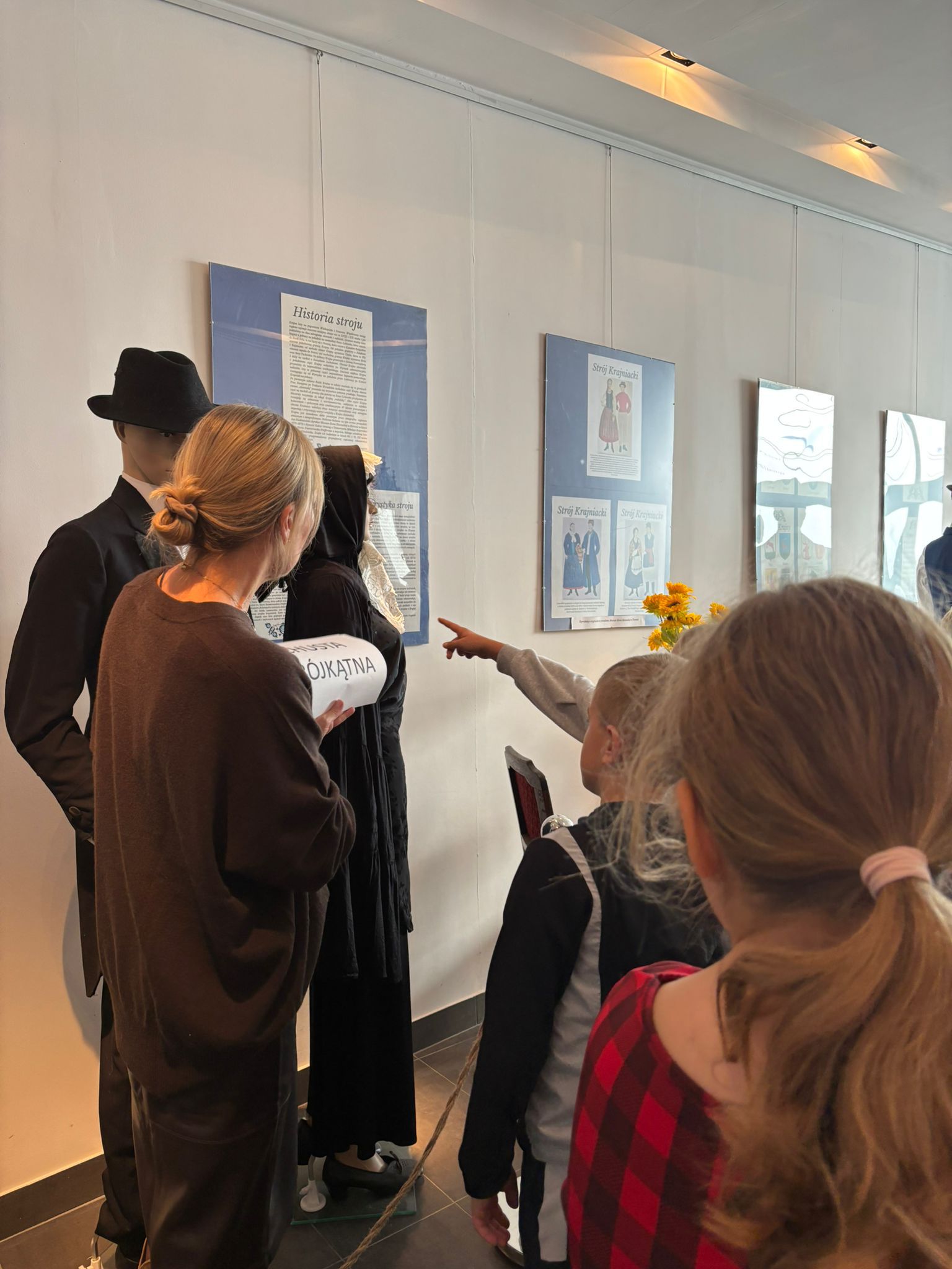 Dzieci mogły zobaczyć, jak ubierano się wiele lat temu, obejrzeć tradycyjne stroje ludowe oraz dowiedzieć się, z jakich materiałów były wykonywane. Uczniowie z zainteresowaniem słuchali opowieści o codziennych zajęciach dawnych mieszkańców wsi i miasta.