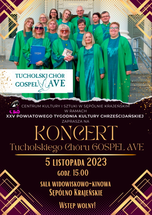 Mamy przyjemność zaprosić Państwa na koncert Tucholskiego Chóru Gospel Ave, który odbędzie się w ramach Srebrnej Gali Jubileuszowej z okazji 25-lecia Powiatowego Tygodnia Kultury Chrześcijańskiej. Tucholski Chór Gospel Ave , którego założycielką jest Pani Donata Świerczyńska, to zespół składający się z osób z ogromną pasją, którzy przez swoją muzykę i interpretacje przekazują przesłanie nadziei, miłości i wiary. Chór wystąpi na deskach sępoleńskiego Centrum Kultury i Sztuki 5 listopada o godz. 15:00. Wstęp na to wydarzenie jest bezpłatny.