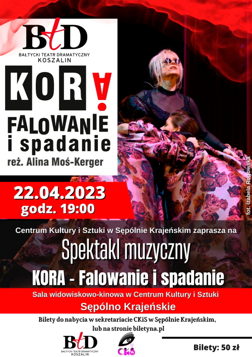 Wraz z Bałtyckim Teatrem Dramatycznym im. J. Słowackiego z Koszalina zapraszamy Państwa na niezwykle elektryzujący, spektakl muzyczny poświęcony wokalistce zespołu Maanam – Korze, pt: „Kora. Falowanie i spadanie” który zostanie wystawiony 22 kwietnia o godz. 19:00, w sali widowiskowo-kinowej w Centrum Kultury i Sztuki w Sępólnie Krajeńskim.