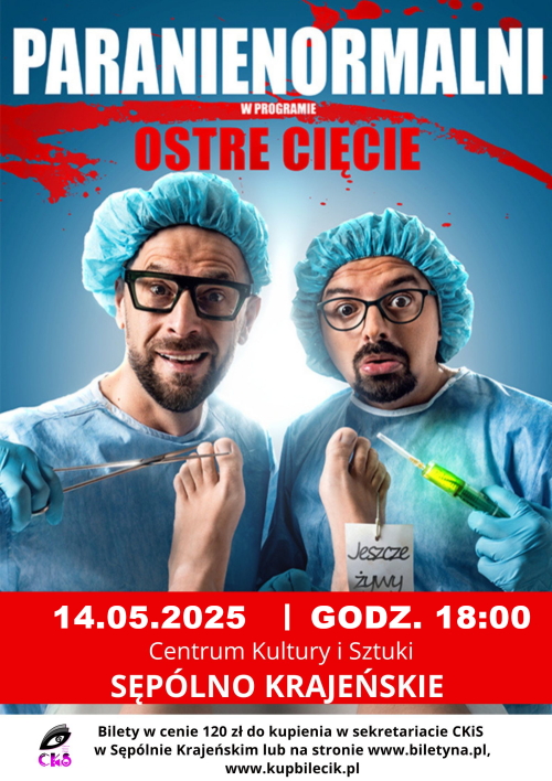 Czy jesteście gotowi na prawdziwy spektakl komedii, który rozbroi Wasze troski i zostawi jedynie śmiech? Jeżeli tak, to zapraszamy już 14 maja 2025 r. o godz. 18:00 na sępoleńskiej scenie w Centrum Kultury o Sztuki wystąpi dla Państwa Kabaret Paranienormalni ze swoim nowym programem pt: Ostre Cięcie!