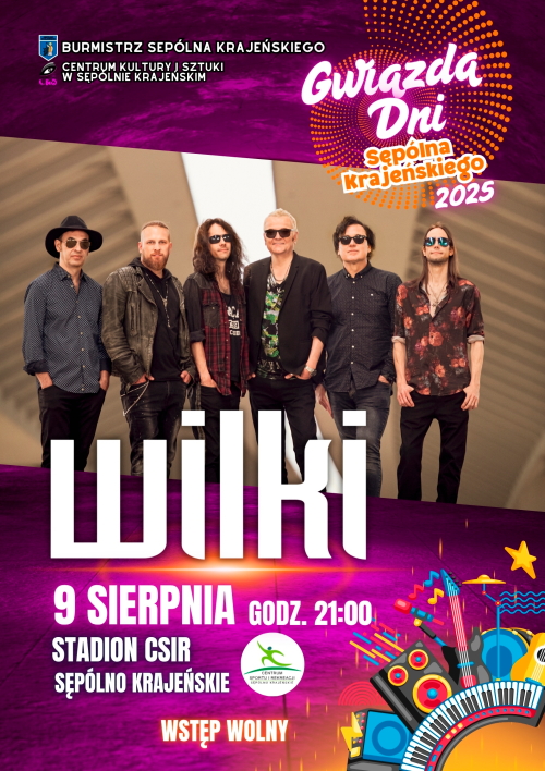 Gwiazdą tegorocznych Dni Sępólna Krajeńskiego będzie grupa Wilki. Dowodzony przez charyzmatycznego wokalistę, Roberta Gawlińskiego, zespół wystąpi podczas koncertu finałowego, 9 sierpnia o godzinie 21:00 na sępoleńskim stadionie Centrum Sportu i Rekreacji. Powstała w roku 1991 formacja na przestrzeni lat zyskała status legendy polskiej muzyki rozrywkowej. Przeboje takie, jak „Urke”, „Eli Lama Sabachtani”, „Bohema”, „Baśka” czy „Nie stało się nic” znają i kochają całe pokolenia. Już wkrótce Sępólno Krajeńskie będzie miało niezwykłą okazję zaśpiewać je wspólnie z Robertem Gawlińskim. Koncerty Wilków to połączenie zjawiskowego show z potężną dawką rockowej energii. Szykujcie gardła, przypomnijcie sobie teksty i spotkajmy się razem pod sceną!