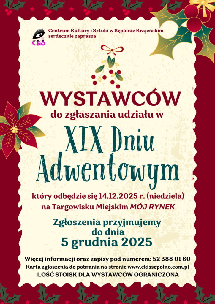 Dzień Adwentowy w Sępólnie Krajeńskim to już tradycja. Wydarzenie na stałe wpisało się w kalendarz imprez organizowanych przez sępoleńskie Centrum Kultury i Sztuki. Tegoroczna XIX edycja odbędzie się 14 grudnia (niedziela), tradycyjnie na targowisku miejskim MÓJ RYNEK w Sępólnie Krajeńskim. Zapraszamy zatem wystawców dzieł rękodzielniczych do zgłaszania swoich stoisk w wydarzeniu. Osoby zainteresowane prosimy o kontakt telefoniczny pod numerem 52 388 01 60.
